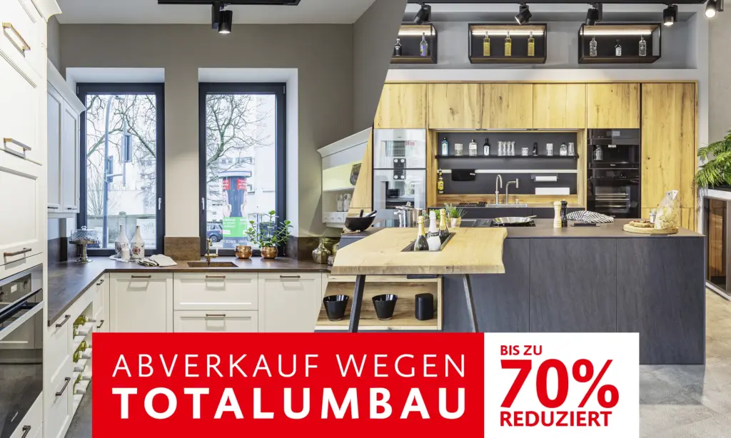[/fusion_title][fusion_text hide_on_mobile=“small-visibility,medium-visibility,large-visibility“ sticky_display=“normal,sticky“ animation_direction=“left“ animation_speed=“0.3″ animation_delay=“0″]Wir modernisieren unsere Ausstellung in Recklinghausen! Einige Küchen sind bereits verkauft, doch es gibt noch zahlreiche Gelegenheiten, eine Traumküche zu einem unschlagbaren Schnäppchenpreis zu ergattern.Da an der Herner Straße 41a Platz für Neuheiten geschaffen wird, läuft dort der Abverkauf. Ob Landhausküche oder moderne Designküche – es sind noch zahlreiche Varianten verfügbar, mit Preisnachlässen von bis zu 70%!