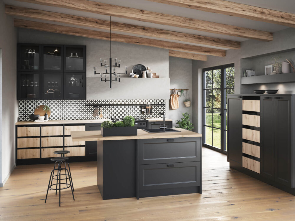 Diese Häcker Landhausküche Ravenna schwarz beweist einmal mehr, wie vielseitig der Landhausstil sein kann. Denn die dezenten Rahmenfronten passen hervorragend zu den hellen Holzfronten und den Vitrinen Oberschränken.